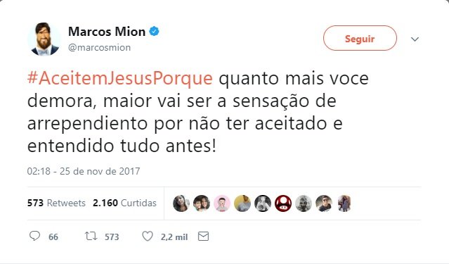 "#AceitemJesusPorque quanto mais voce demora, maior vai ser a sensação de arrependiento por não ter aceitado e entendido tudo antes!", publicou ele.
