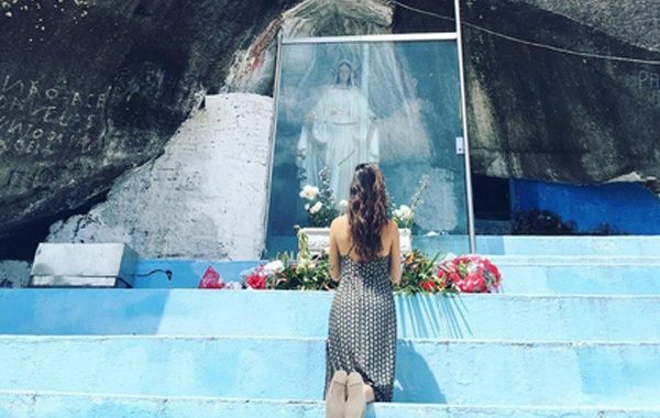 Atriz postou outra foto ajoelhada em frente a santo católico