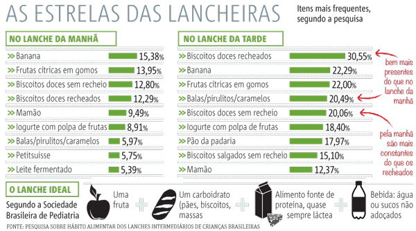 Pesquisa feita com 1.391 crianças entre 4 e 6 anos de todo o país mostrou que somente nos lanches intermediários feitos por elas de manhã e à tarde é consumida quase toda a quantidade de açúcar de adição estabelecida como limite por dia pela OMS (Organização Mundial da Saúde).